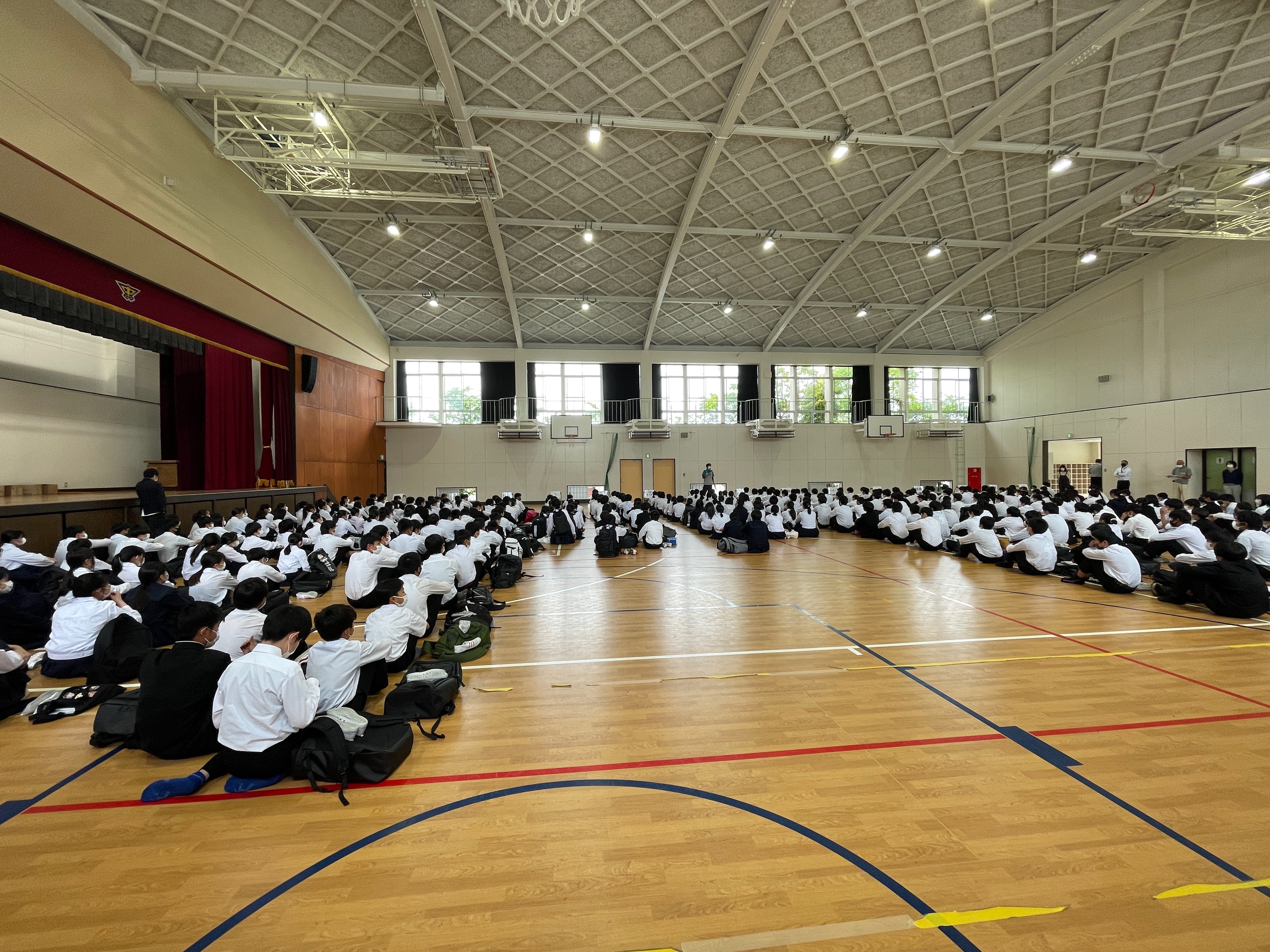 各部キャプテンや部長を中心に、整列に戸惑いながらもすぐに話を聞ける態勢になりました。生徒指導主事の宮崎先生から、部活動の目的や活動するにあたって、皆さんに知っておいてほしいことを話していただきました。これから3年生は部活動の総まとめの時期。これまでコロナ等で思う存分部活に取組めてなかったと思います。残された時間を大切にしてくださいね。